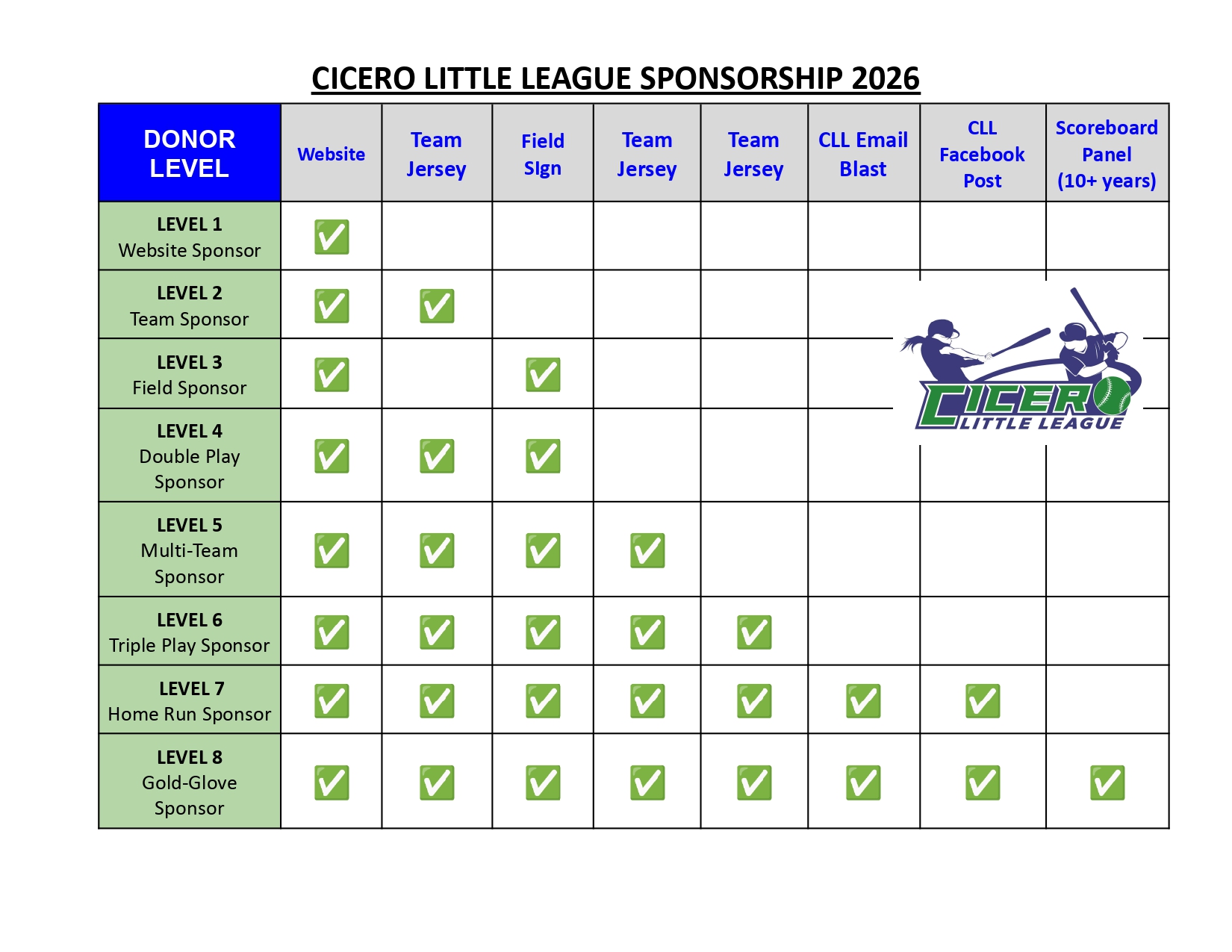 Cicero Little League is proud to offer the children of our community the opportunity to learn and play baseball and softball. Annually, our league has between 500 to 600 boys and girls ranging in age from 5 to 16 years old. We are 100% volunteer run organization with the mission of providing a "big league experience for our little league players." Running a League is not only a time consuming, but an expensive endeavor. There are equipment needs such as balls, bats, tees and helmets. We have field and park maintenance equipment such as a PA system, scoreboards, batting cages, and field maintenance equipment. We organize clinics to help develop the skills of players and coaches. We Need Your Help!